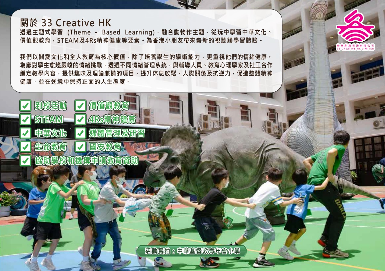 33CreativeHK 透過主題式學習(Theme-Based Learning),融合動物作主題,從玩中學習中華文化、價值觀教育、STEAM及4Rs精神健康等要素。為香港小朋友帶來嶄新的視聽觸學習體驗。